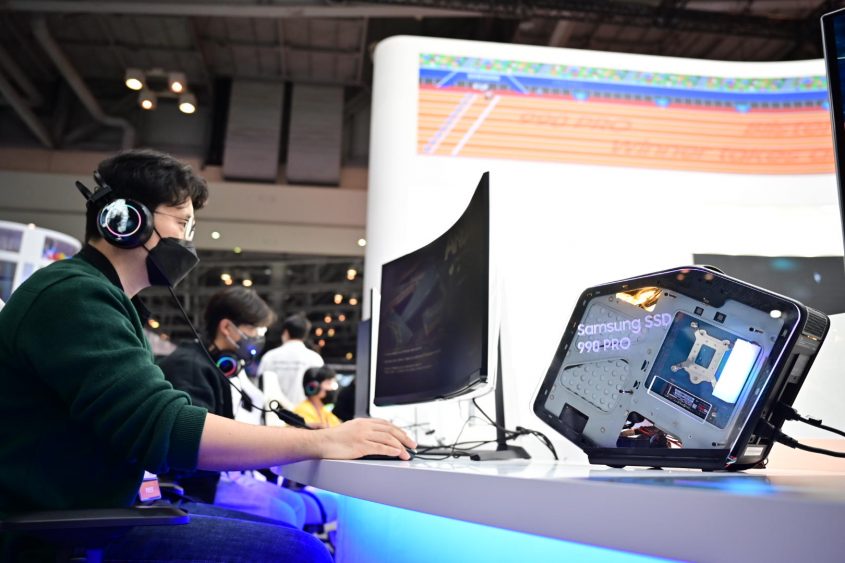 ▲삼성전자 브랜드관에 마련된 체험존에서 게이밍에 최적화된 고성능 SSD ‘990 PRO’로 게임을 체험하고 있는 모습