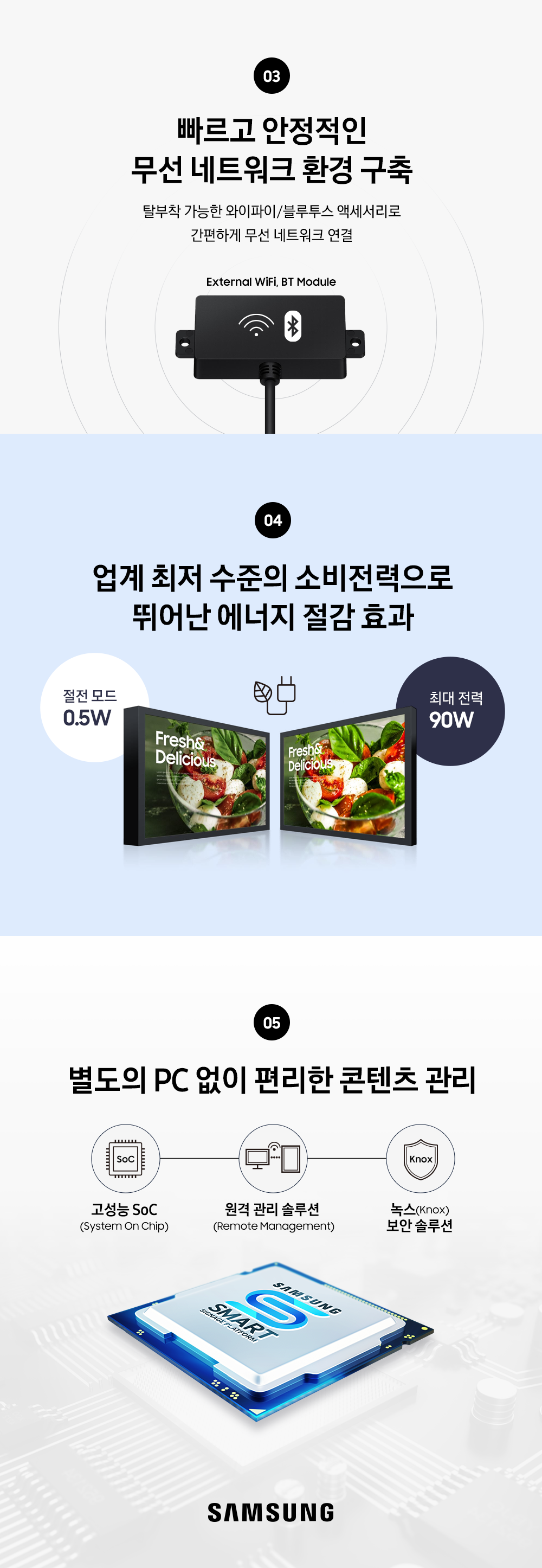 사용방법도 편리하다. OH24B에는 고성능 SoC(System On Chip) 기능이 탑재되어 별도의 PC 없이도 콘텐츠 관리가 가능하다. 또한, 클라우드 기반의 기기 및 콘텐츠 관리 플랫폼인 ‘매직인포 (MagicINFO)’ 솔루션을 통해 콘텐츠를 원격으로 실시간 관리할 수도 있다.