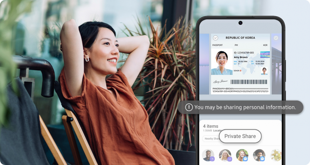 사용자의 개인 정보를 비공개 유지하기 위해 One UI 5는 공유 패널에 새로운 알림 기능을 추가로 제공한다.[2] 신용카드, 운전면허증, 주민등록증 또는 여권과 같이 민감한 개인 정보가 포함된 사진을 공유하려고 할 때, 의도치 않게 해당 정보가 포함된 건 아닌지 다시 한번 확인할 수 있다.