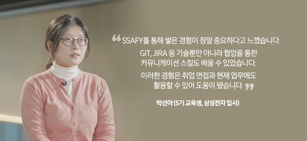 SSAFY 5기 수료생 박선아 씨(삼성전자 입사)는 컴퓨터공학을 전공했지만 좀 더 실력을 키우면서 취업 전 다양한 프로젝트 경험을 쌓기 위해 SSAFY에 지원했다. SW 관련 최신 기술을 이용해 여러 프로젝트를 수행하면서 기획부터 구체화시키는 과정 등을 익혔다. 여기서 배운 기술과 경험은 현재 업무에 실제로 활용할 수 있어 큰 도움이 되고 있다.