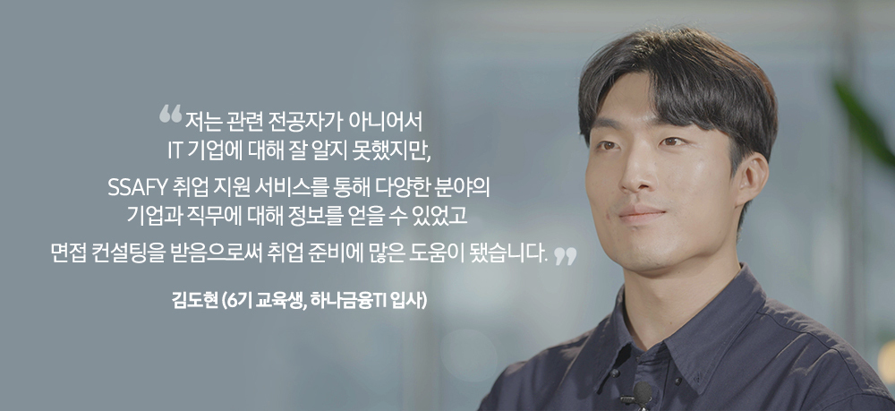 6기 수료생 김도현 씨(하나금융TI 입사)는 경제학을 전공했다. 하지만 다른 직무로 취업을 준비하다 보니 IT 기업에 대한 정보가 부족해 어려움을 겪던 중 SSAFY를 알게 되어 지원했다. 개발 수업과정뿐만 아니라 여러 분야의 기업 정보와 직무, 채용설명회 등 다양한 정보를 제공하는 지원 서비스를 통해 취업에 성공할 수 있었다고 말했다.