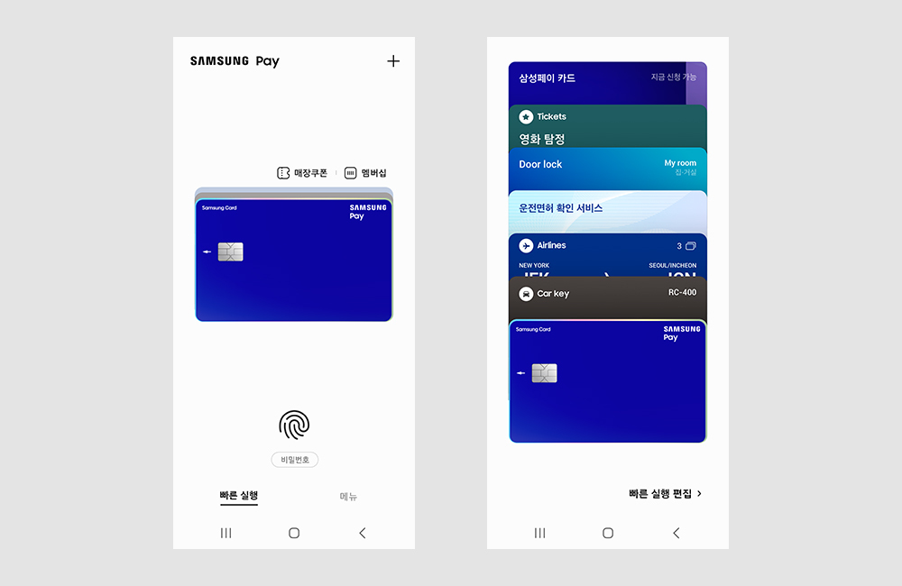 삼성페이는 결제 수단에 그치지 않고 다양한 추가 서비스도 제공한다. 집이나 자동차 키로 활용할 수 있는 디지털 키[1], 가상 자산을 한 눈에 확인할 수 있는 디지털 자산 조회[2], 항공권[3]과 영화표[4] 등을 보관할 수 있는 티켓 서비스 등의 기능도 담고 있다.