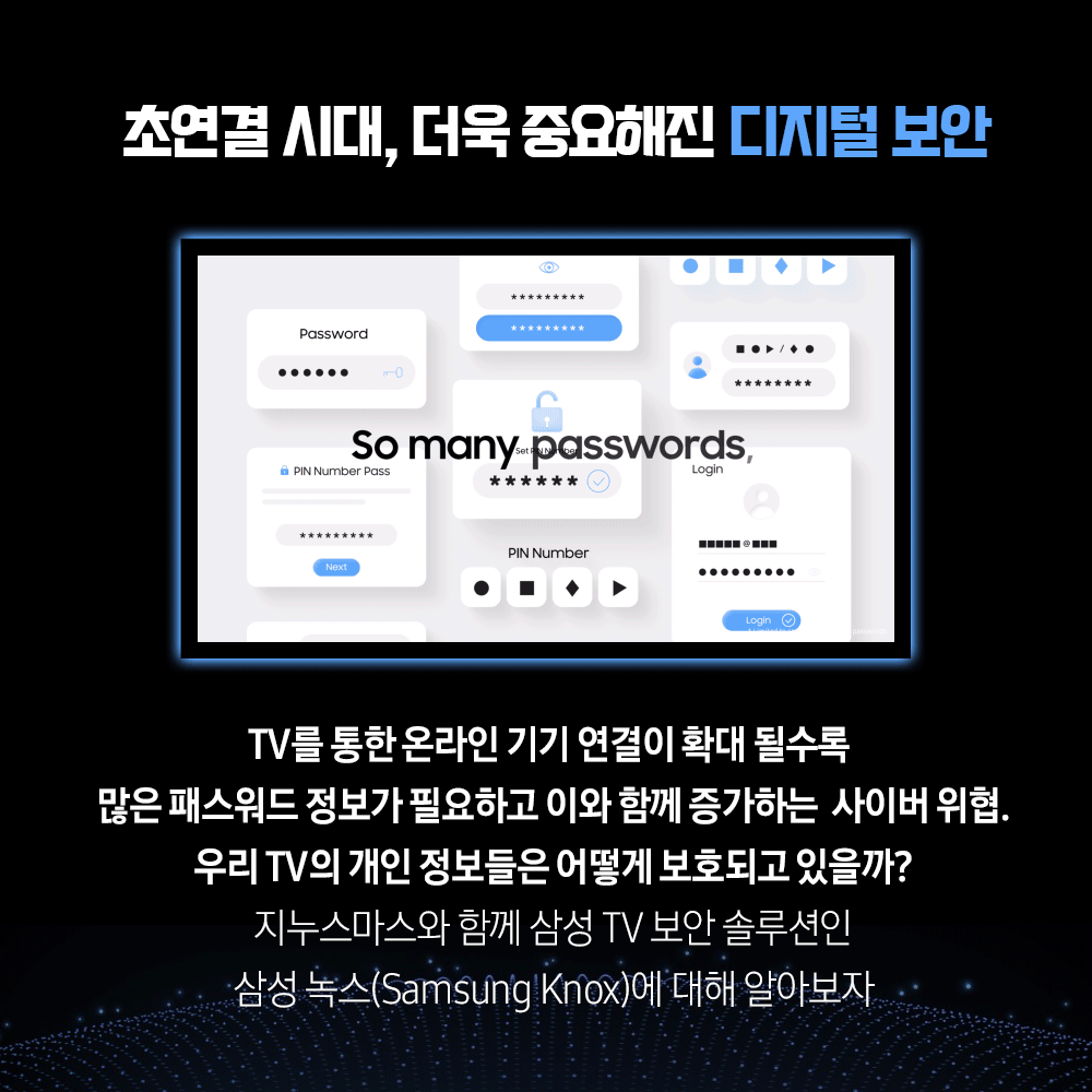 삼성전자는 혁신 보안 프로그램 ‘녹스’를 통해 TV 보안은 물론, 안전하고 편리한 스마트 홈 라이프를 선사하고 있다. 귀여운 지누스마스와 함께 스마트 홈 생태계의 완성인 ‘삼성 녹스’를 카드 뉴스로 알아보자.