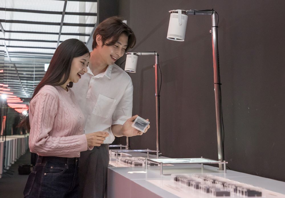 ▲ 삼성전자 모델들이 지난 9일부터 서울 강남구 삼성동에서 진행 중인 하이브 레이블즈(HYBE LABELS) 소속 아티스트 초상 사진 전시회 ‘The Daydream Believers : 꿈, 마침내’에서 삼성 포터블 스크린 ‘더 프리스타일’을 활용한 디지털 사진 인화 체험을 하고 있는 모습. 하이브 레이블즈 소속 아티스트 초상 사진이 담긴 칩을 특정 슬롯에 위치시키면 더 프리스타일을 통해 확대해 볼 수 있다.