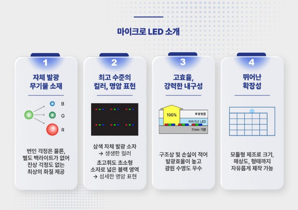 패널 구조상 컬러를 표현하기 위한 액정과 컬러 필터가 별도로 있는 LCD 제품과 달리 마이크로 LED는 광원에서 바로 컬러를 표현하기 때문에 컬러 표현과 휘도 측면에서 모두 유리하다. 게다가 무기물 소재 LED 칩으로 이루어져 있기 때문에 화면에 잔상이나 얼룩이 남는 번인(Burn-in) 현상도 걱정 없다.