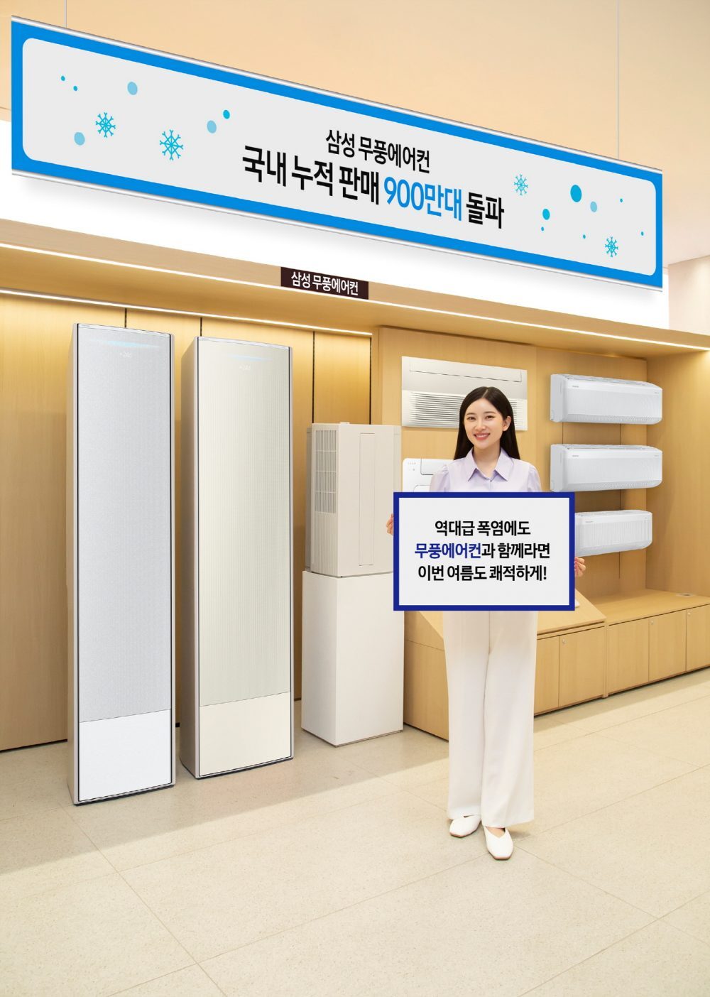 삼성 무풍에어컨이 국내 시장에서 누적 판매량 900만대를 돌파했다. 2016년 무풍에어컨 출시 이후 7년 넘게 매일 약 3,300대가 판매된 셈이다.