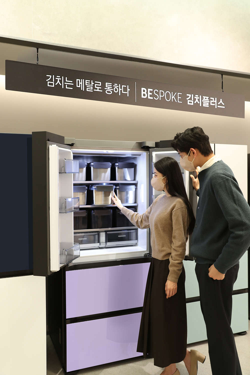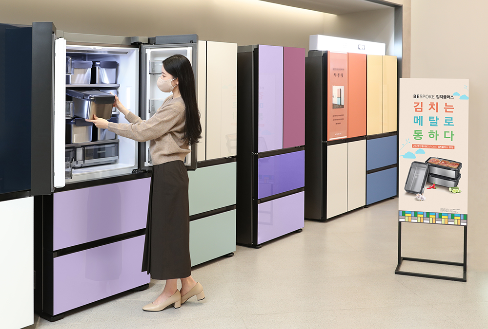 ▲삼성전자 모델이 삼성 디지털프라자 대치본점에서 비스포크 김치플러스 메탈 김치통을 선보이고 있다.