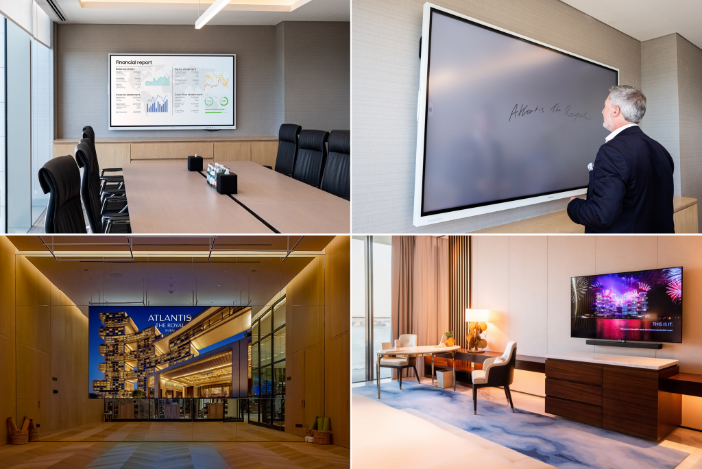 또 높은 층고가 특징인 피트니스의 요가 스튜디오에는 스마트 사이니지가 설치되어 있어 상황과 목적에 따라 필요한 콘텐츠를 손쉽게 제공한다. 아틀란티스 더 로열의 최상위 객실 외 795개 전 객실에는 4K 화질의 삼성 호텔 TV가 설치되어 있어 투숙객에게 몰입감 높은 콘텐츠와 편안한 휴식을 선사한다.