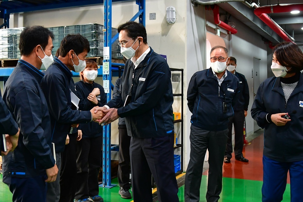 ▲ 지난 11월 8일 이재용 삼성전자 회장이 삼성전자로부터 스마트공장 구축 지원을 받은 부산 소재 중소기업 ‘동아플레이팅’을 방문해 현장을 둘러보는 모습. 이재용 회장은 회장 취임 후 첫 스마트공장 방문 현장에서 “건강한 생태계를 조성해 상생의 선순환을 이뤄야 한다”고 강조했다.