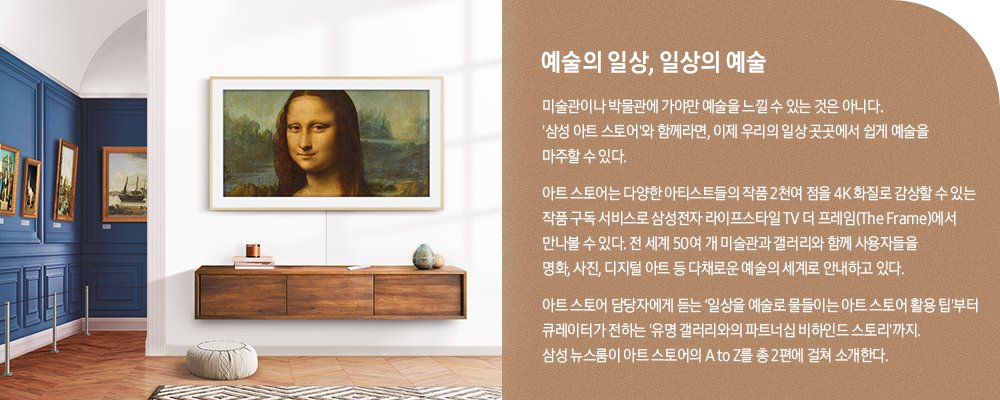 TV에 예술을 접목시켜 ‘일상 속 예술’을 실현해 나가고 있는 ‘삼성 아트 스토어’. 세계적인 명작부터 현대 미술과 사진에 이르기까지 매월 다채로운 큐레이션 작품을 제공하며 라이프스타일 TV ‘더 프레임(The Frame)’ 사용자들을 예술의 세계로 안내하고 있다.