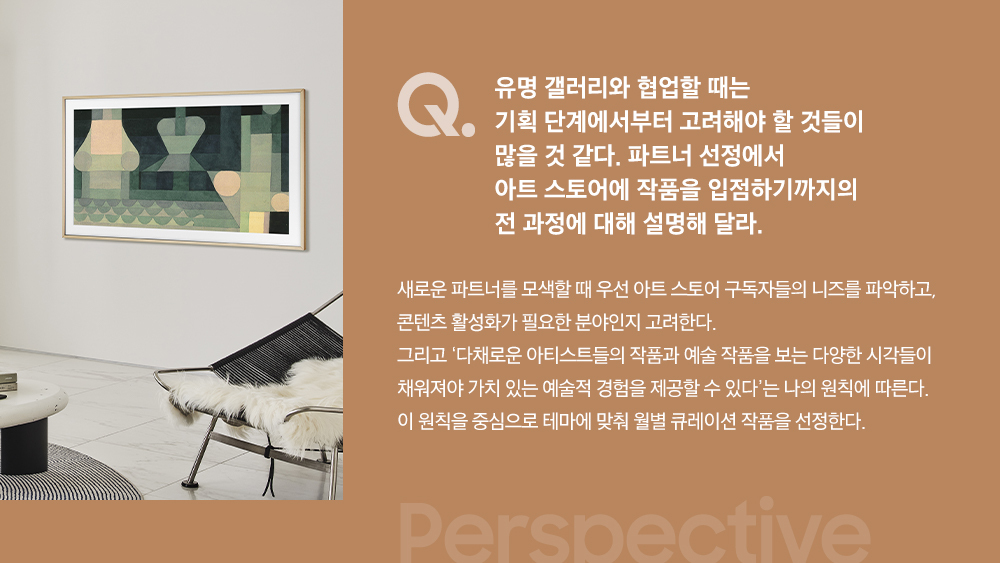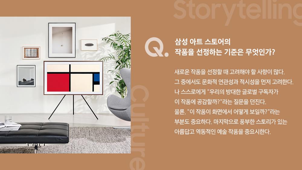 다양한 작품들은 어떻게 선정되는 것일까? 뉴스룸이 삼성 아트 스토어 큐레이터 ‘다리아 브릿 그린(Daria Brit Greene)’과의 인터뷰를 통해 작품 선정 기준과 과정에 대해 들어 보고, 예술과 함께하는 일상의 가치에 대해 생각해 보는 시간을 가져 봤다.