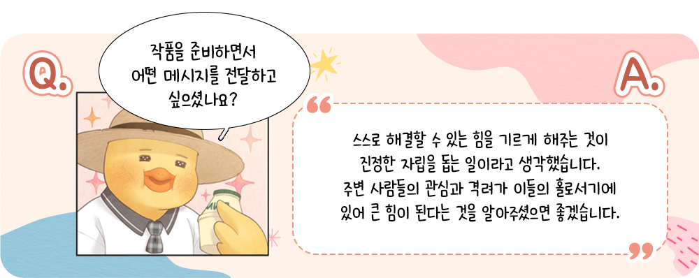 작가는 자립준비청년들은 주변 사람들의 관심과 응원에서 사회로 나갈 수 있는 용기를 갖게 된다고 전했다. ‘수의사 해보면 어때요’라는 나리의 한마디에 윤정이는 진로를 진지하게 고민하면서 자신감을 느끼게 되는 것처럼, 따뜻한 관심과 칭찬은 자립준비청년들에게 큰 힘이 된다.
