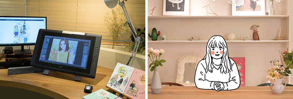▲ 왼쪽부터 『소녀의 디딤돌』 작품이 탄생한 모랑지 작가 작업실과 모랑지 작가 인터뷰 장면(인물은 캐릭터화)