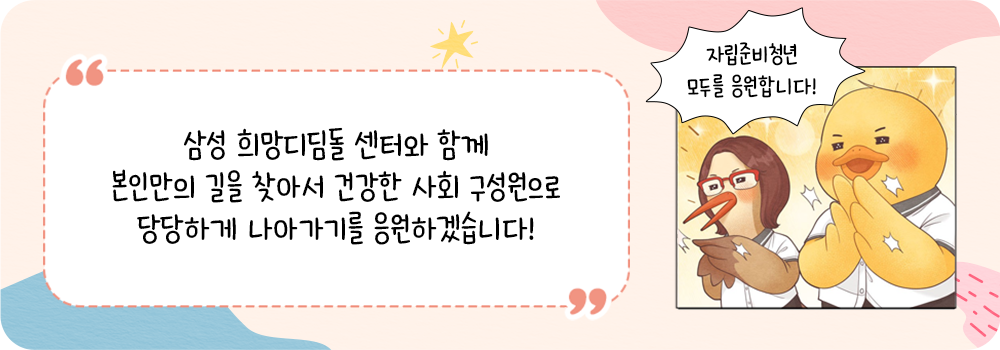 세상의 모든 윤정이들이 스스로 꿈을 찾고 멋진 어른으로 사회에 우뚝 서는 그날까지, 삼성 희망디딤돌은 이들 곁에서 든든한 울타리이자 버팀목이 되어줄 것이다.