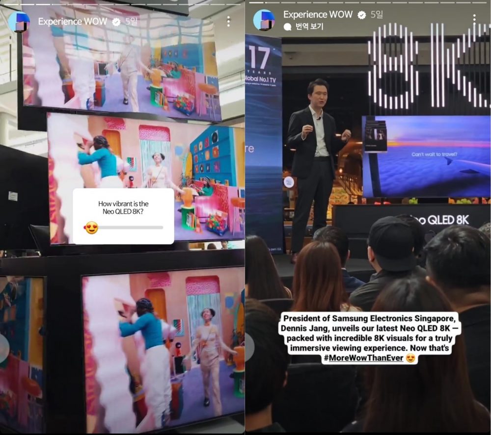 ▲ 싱가포르 법인은 공식 인스타그램 계정에서 실시간으로 진행 상황을 포스팅해 참석하지 않는 고객들도 간접 체험을 할 수 있게 했다. 장석우 싱가포르 법인장이 Neo QLED 8K를 소개하는 모습(오른쪽).