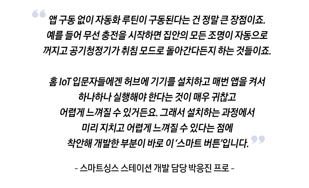 스마트싱스 스테이션의 기술 개발을 담당한 박응진 프로는 “개발자들 역시 사용자들의 IoT 진입 장벽에 대한 고민을 많이 했는데, 그 결과가 바로 이 ‘스마트 버튼’이다. 사용자들은 스마트 버튼을 간단하게 터치하는 것만으로도 미리 설정해 놓은 자동화 루틴을 빠르게 실행할 수 있다”고 전했다.