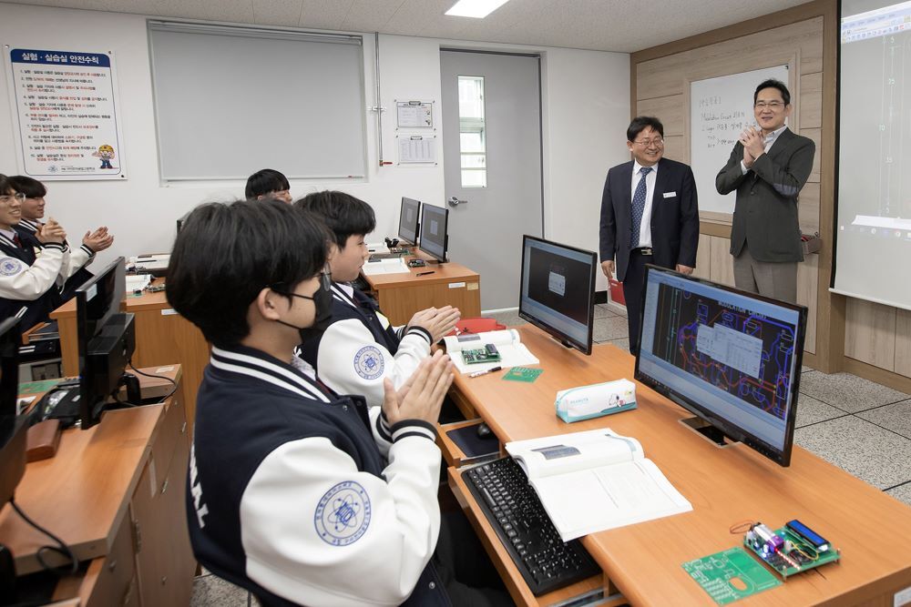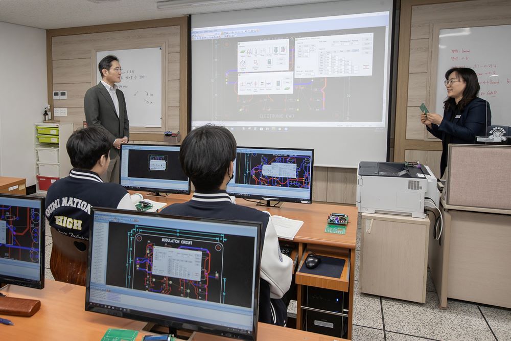 – 이 회장은 ‘PCB(전자기기용 인쇄회로기판)’ 설계 수업을 참관했다.
