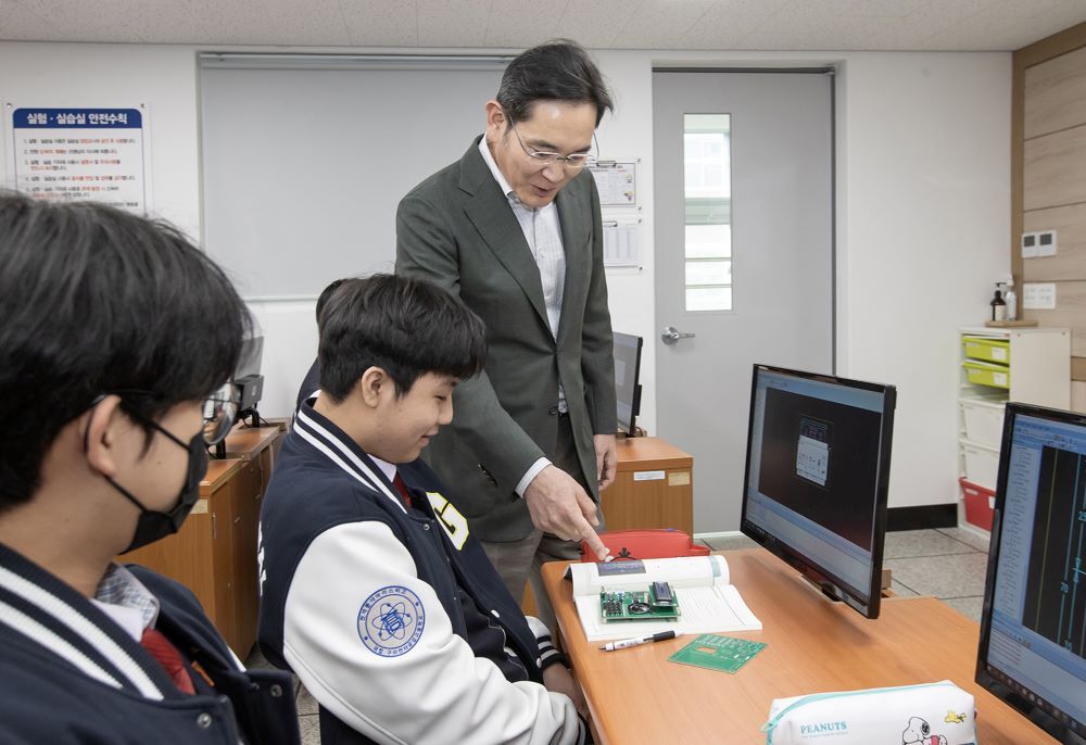 ▲ 이재용 삼성전자 회장이 7(화)일 경북 구미시에 위치한 ‘구미전자공업고등학교’를 방문해 수업을 참관하고 학생들과 기념사진을 촬영하는 모습
