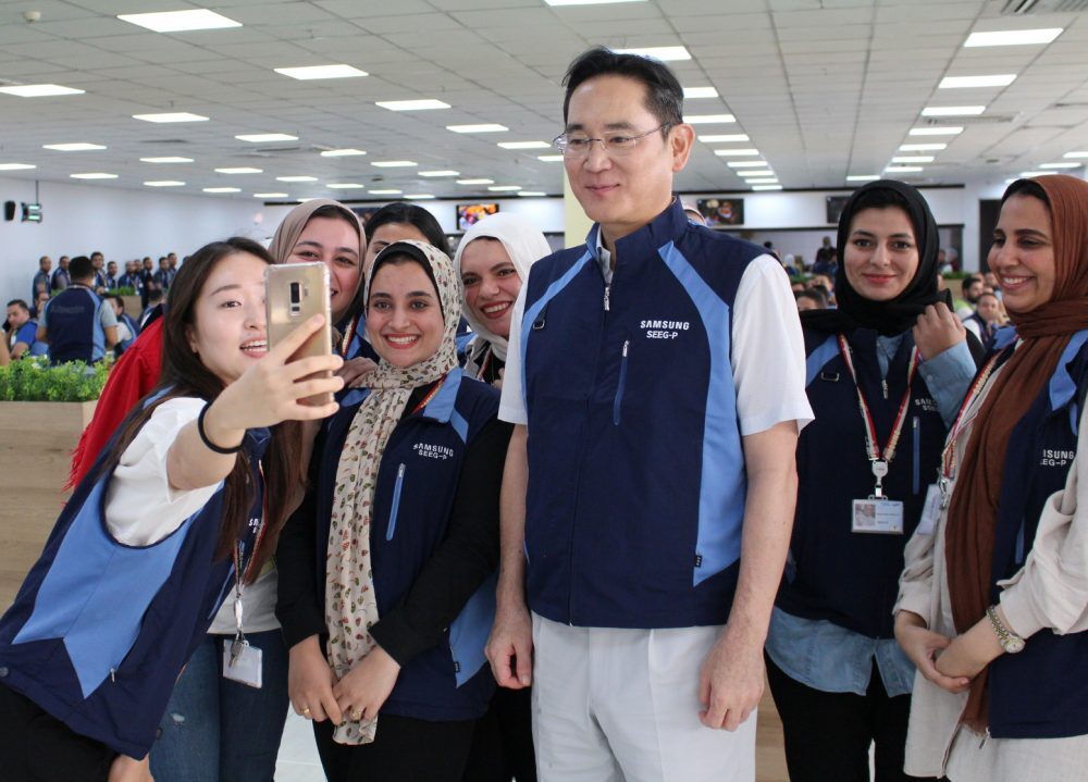 ▲ 이재용 삼성전자 회장이 1일(현지시간) 이집트 중부 베니수에프주(州)에 위치한 삼성전자 TV·모바일 공장을 찾아 근무 중인 임직원들과 셀카를 찍고 있다. 이 회장은 추석 연휴인 지난 달 28일부터 이날까지 사우디아라비아와 이스라엘·이집트를 찾아 현지 사업장에서 근무 중인 임직원들을 격려하고 사업 확대 방안을 논의했다.