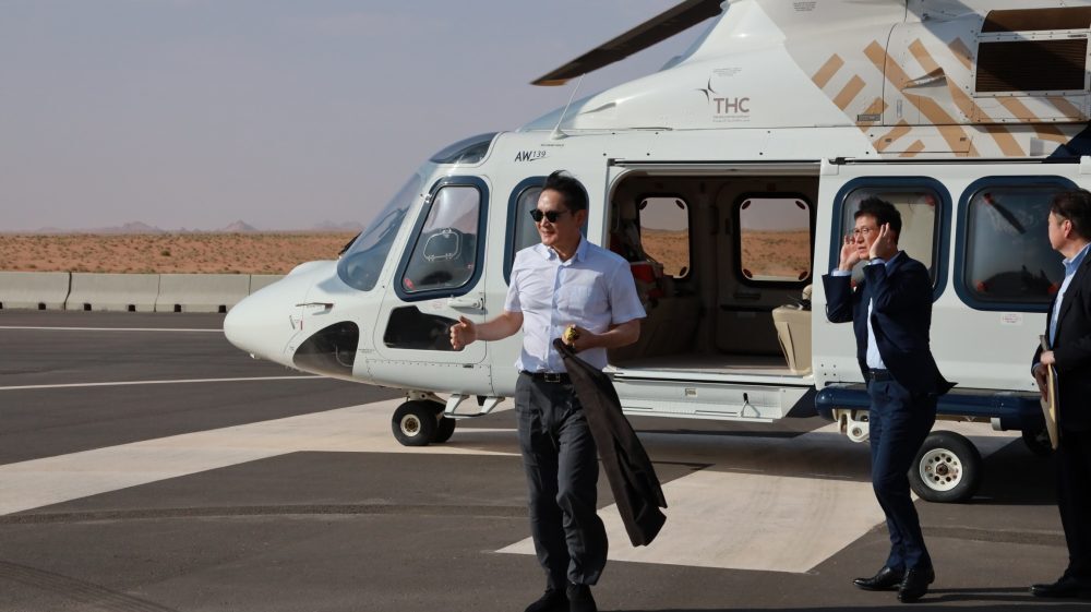 ▲ 이재용 삼성전자 회장이 1일(현지시간) 사우디아라비아 서북부 타북주(州) ‘네옴(NEOM)’ 신도시 건설 현장에 헬기로 도착해 삼성물산이 참여하는 네옴시티 지하 터널 공사 현장으로 이동하고 있다.이 회장은 추석 연휴인 지난 달 28일부터 이날까지 사우디와 이스라엘·이집트를 찾아 현지 사업장에서 근무 중인 임직원들을 격려하고 사업 확대 방안을 논의했다.