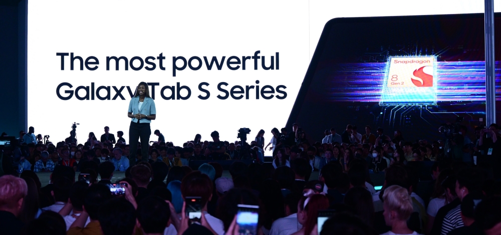 ▲ 최신 프로세서 ‘스냅드래곤® 8 2세대’가 탑재된 갤럭시 탭 S9은 끊김 없는 고품질 그래픽을 통해 게이밍 기기로도 손색없는 강력한 성능을 자랑한다. 삼성전자 북미총괄 다니엘 모튼(Danielle E Moten)이 ‘스냅드래곤® 8 2세대’를 소개하는 모습