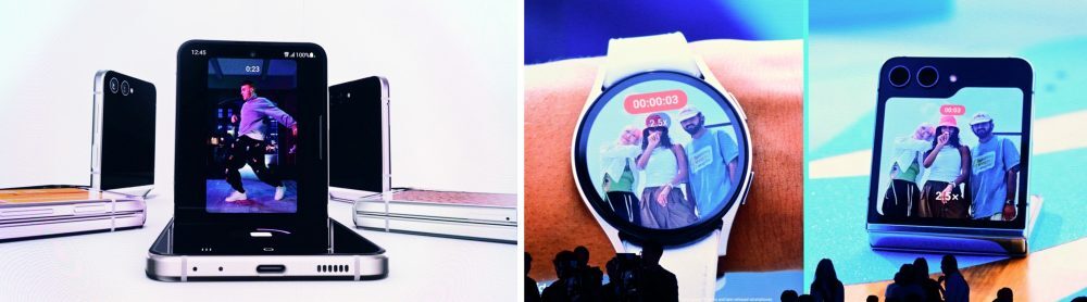 갤럭시 Z 플립5의 가장 눈에 띄는 변화는 외관 디자인이다. 전작 대비 한층 넓어진 커버 디스플레이, ‘플렉스 윈도우(Flex Window)’는 폴더블 폰에서의 사용자 경험을 한 차원 더 끌어올렸다. 특히 플렉스 윈도우를 활용해 더욱 쉽고 다양하게 즐길 수 있는 카메라 촬영에 대해 소개되자 객석에서는 환호와 박수 갈채가 쏟아졌다.
