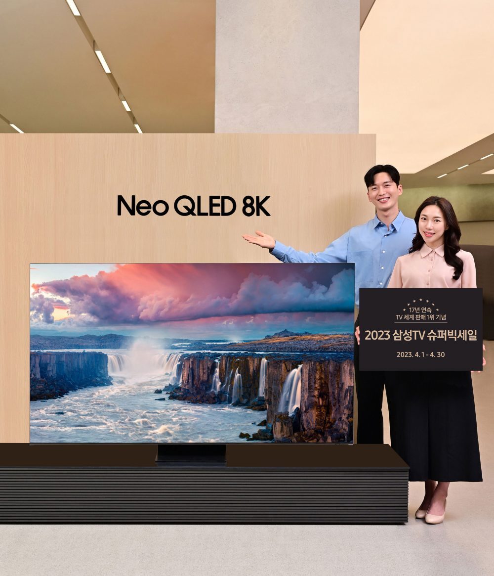 ▲삼성전자 모델이 서울 대치동에 위치한 삼성스토어 대치점에서 ‘2023 삼성 TV 슈퍼빅세일’을 소개하고 있는 모습. 삼성전자는 4월 한달 간 17년 연속 TV 세계 판매 1위 달성을 기념해 2023년형 Neo QLED 신제품 구매 시 혜택을 제공한다. ※ 제품은 Neo QLED 8K 75형
