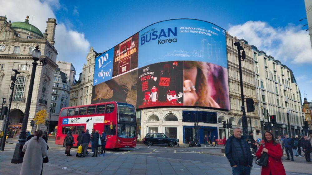▲런던 피카딜리 광장에서 부산엑스포 홍보 영상이 상영 중인 모습