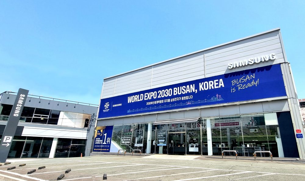 삼성스토어의 현수막을 통해 부산 도심 곳곳에서 ‘WORLD EXPO 2030 BUSAN, KOREA’라는 영어 명칭이 부각되고 엑스포 유치 분위기가 강화될 것으로 기대된다.
