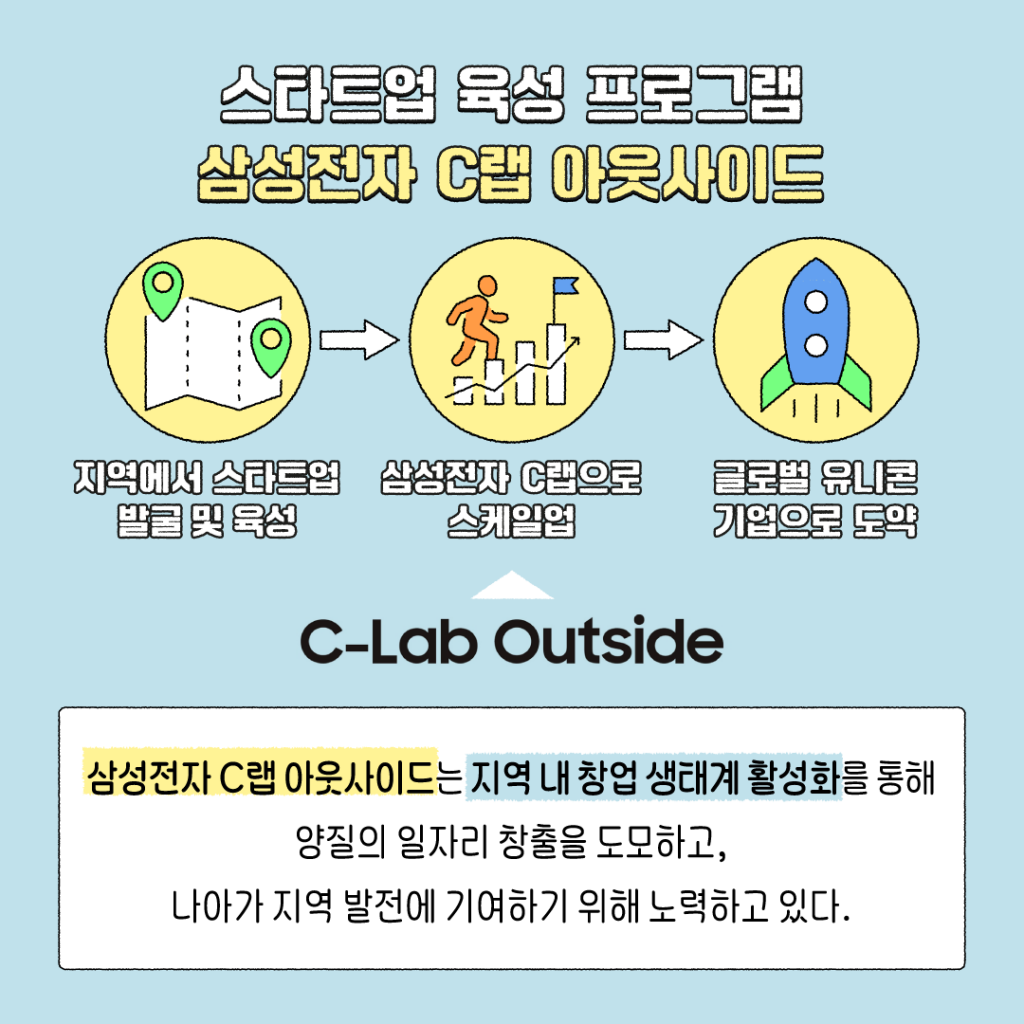 삼성전자는 올해부터 한층 더 지역에 최적화된 스타트업 지원 프로그램을 운영하기 위해 경북도, 영남대학교, 경북창조경제혁신센터와 업무협약을 체결했다. 지역에서 발굴, 육성한 스타트업을 삼성전자의 C랩을 통해 ‘스케일업’해 글로벌 유니콘으로 키운다는 전략이다.