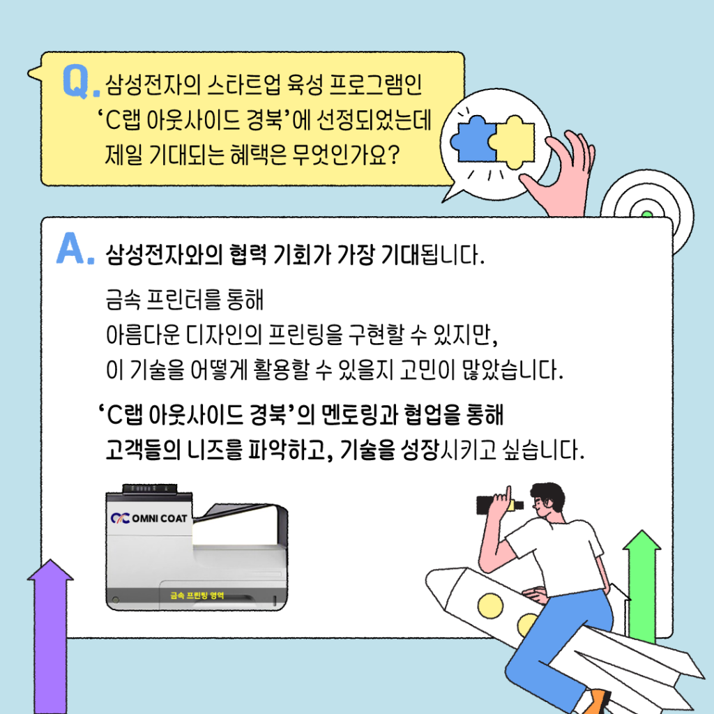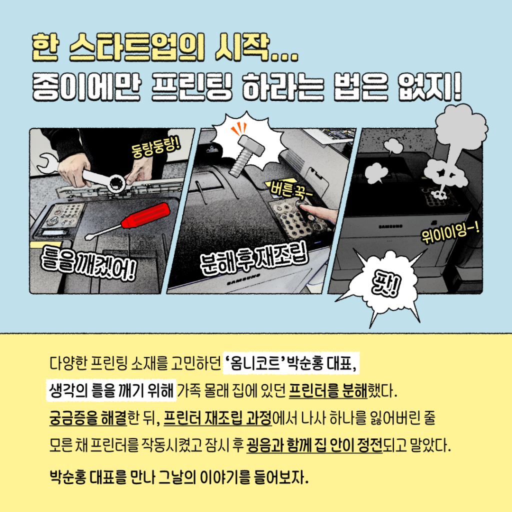 레이저와 LED를 활용한 고속 이미지 프린팅 기업인 ‘옴니코트’ 박순홍 대표의 남다른 개발 이야기부터 열정으로 가득 찬 혁신 스타트업들의 포부까지 아래 카드뉴스를 통해 확인해보자.