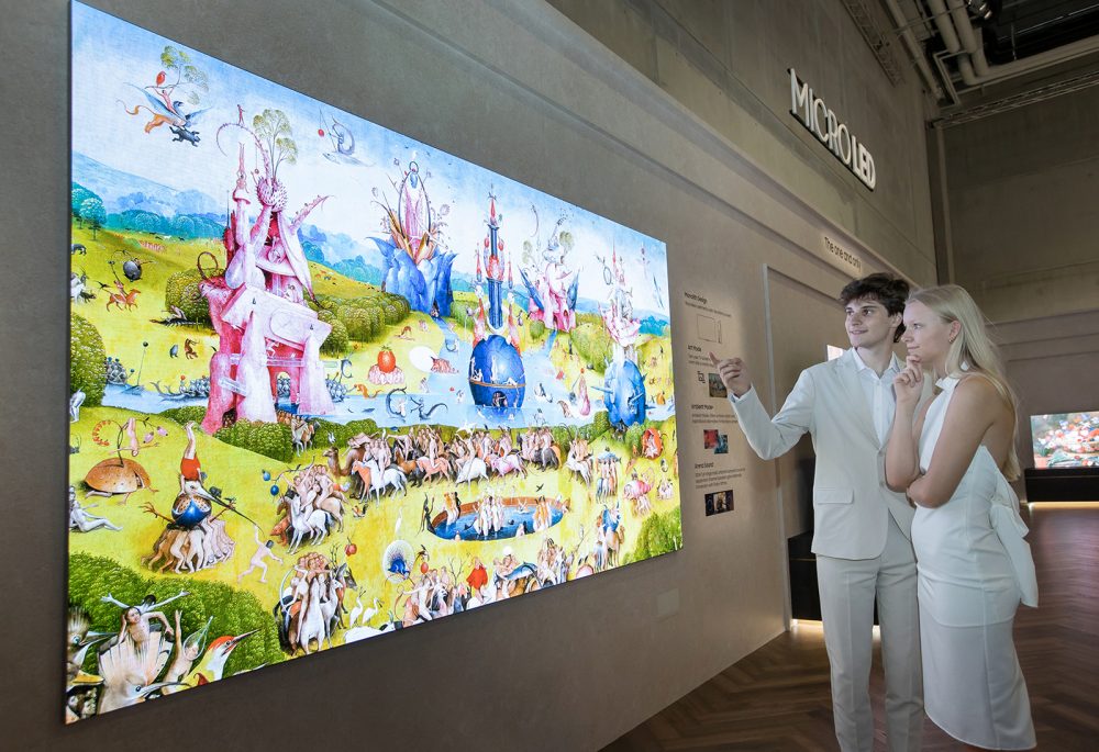 ▲ IFA 2023가 열리는 메세 베를린(Messe Berlin)에 위치한 삼성전자 전시관에서 삼성전자 모델이 ‘마이크로 LED’를 소개하고 있다.