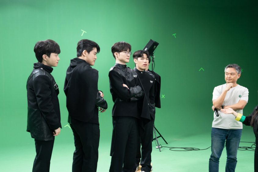 ▲T1 선수단이 브랜드 필름 촬영 중 안무를 다시 한 번 숙지하고 있다.