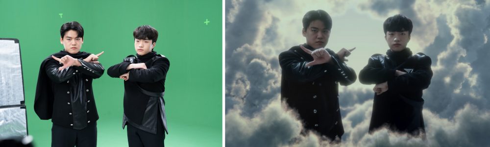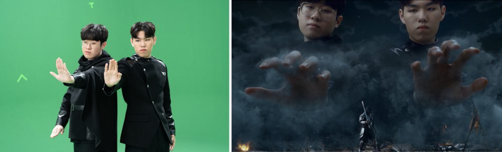 ▲T1 ‘구마유시’(왼쪽)와 ‘케리아’가 오디세이 브랜드 필름을 촬영하고 있다.